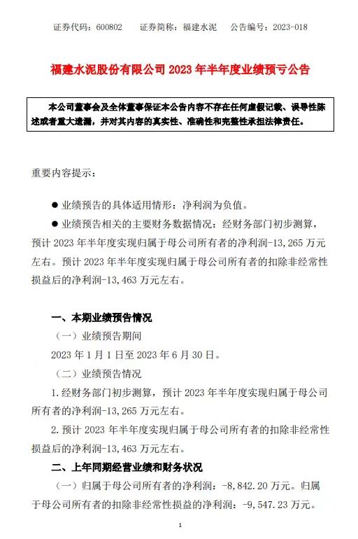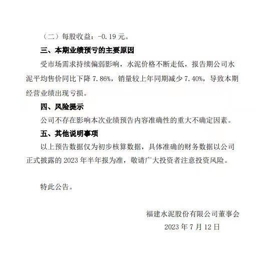 福建水泥7月11日公告,預(yù)計2023年上半年凈虧1.33億元。受市場需求持續(xù)偏弱影響,水泥價格不斷走低,報告期公司水泥平均售價同比下降7.86%,銷量較上年同期減少7.4%,導(dǎo)致本期經(jīng)營業(yè)績出現(xiàn)虧損。