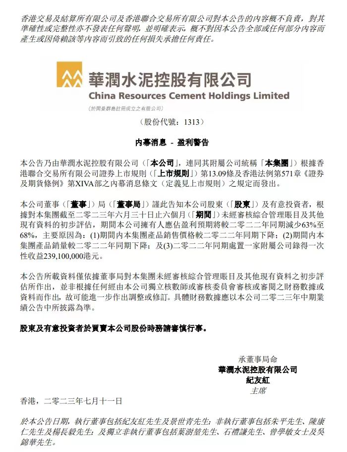 同日,華潤水泥控股7月11日在港交所公告,該集團(tuán)預(yù)期于2023年上半年公司擁有人應(yīng)占盈利同比減少63%至68%。期間內(nèi)集團(tuán)產(chǎn)品銷售價格較2022年同期下降;期間內(nèi)集團(tuán)產(chǎn)品銷量較2022年同期下降;2022年同期處置一家附屬公司取得一次性收益約2.39億港元。